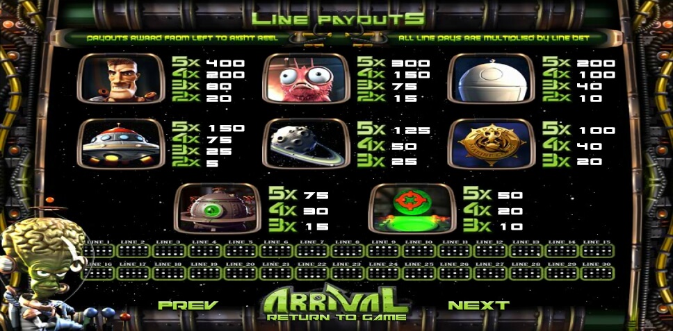 To begin the game, the player should spin the reel, or use the maximum betting to do that. This function will bet five coins on all thirty lines within the game. You should remember – don’t hurry up, take your time and build a strategy. That’s all you need to become a professional in the Arrival gambling. Of course, you can choose an easier way and use the “Auto Play” option. It became super popular nowadays because of the mobile gaming. With automatic bets, the player can do nothing while he is on public transport. The gamer can only look at the monitor and see how many coins he just made. But you still can choose how many times want to spin with it.