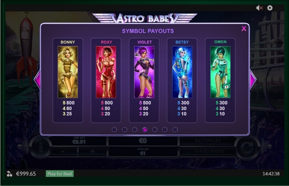 Each reel has its own beautiful “astro babe”: Bonny in a golden spacesuit, Violet in a violet costume, Gwen in a green, red-haired Roxy and Betsy in a blue colored cloth. The girls’ pics are really sexy and bright, so you will not be able to ignore them. Every girl can be a wild symbol that will help you to complete a perfect match in a line.