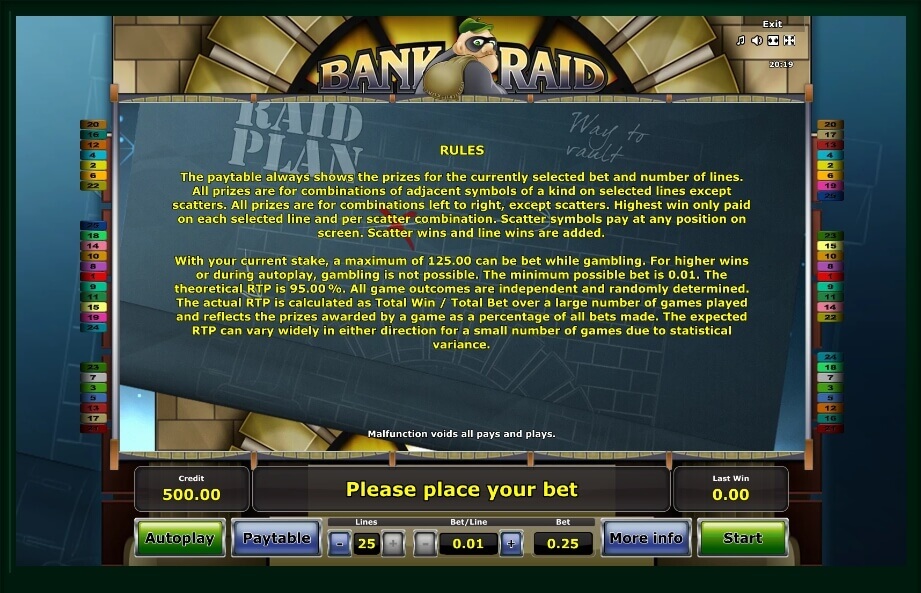 The client needs to visit a section with the rules to carry out the robbery. Click on the “Paytable” button that will open access to all information. As for the game parameters, the “Bet / Line” and “Lines” buttons are intended for them. Now the player only needs to activate the manual or automatic spin mode. The game process is filled with thematic symbols and modern animations that help to plunge into the atmosphere of the slot.