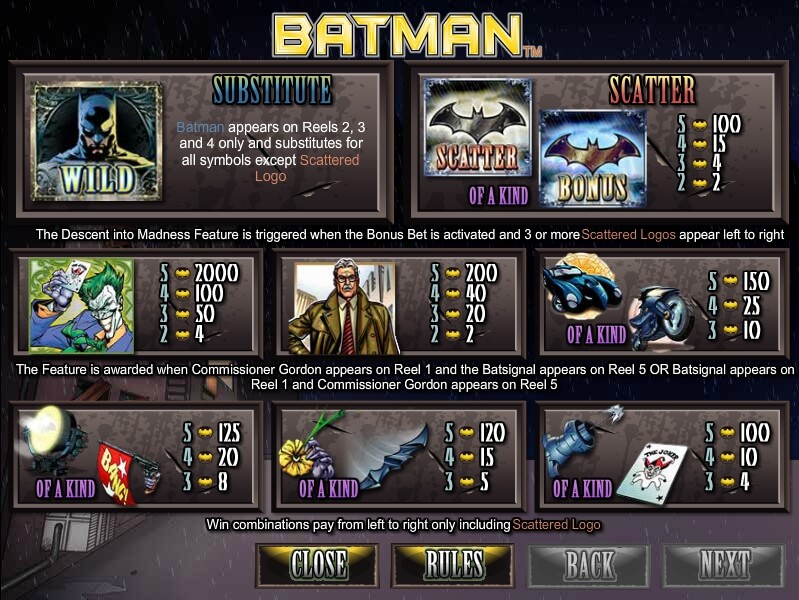 The scatter symbol bat also starts its work here. When 3 such symbols fall on the line, it brings you additional payments. A bonus is the developers` gift. Therefore, if Batman and his friend Gordon are on the first five drums at the same time, the player can wait for the additional prizes. Don`t underestimate the wild symbol in the form of the main hero of the Batman`s saga.