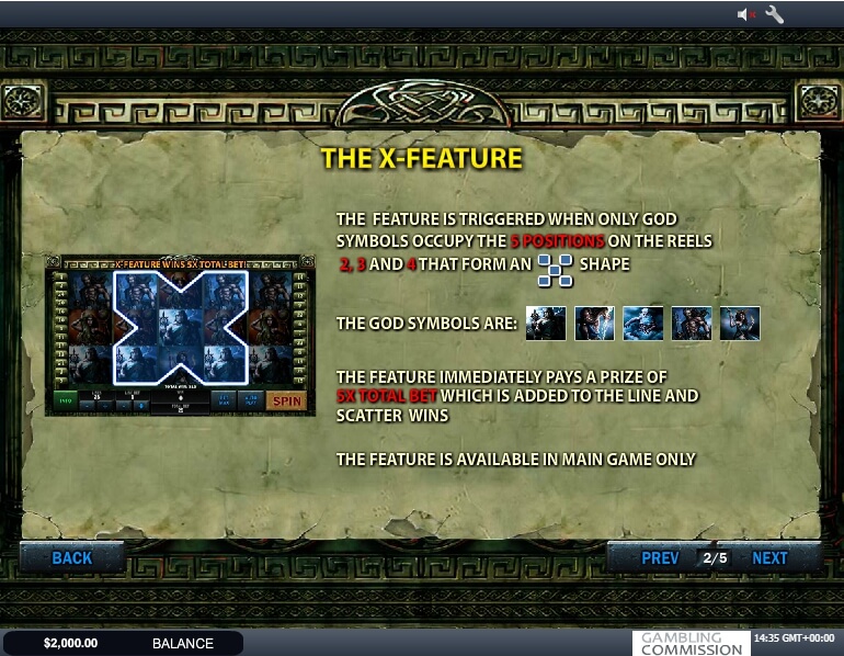 In the slot machine Battle of the Gods there are two bonus options – free spins and X-feature. The last prize option was named for the configuration of the characters that make up it. When 5 symbols of any gods appear crosswise, in the form of the letter X, counting the middle cell of the third drum as the center, 5 general rates are immediately paid.