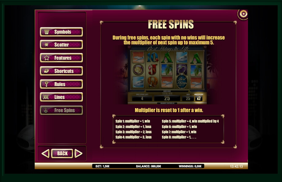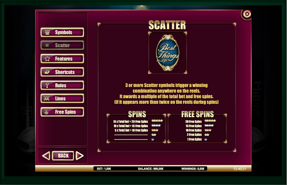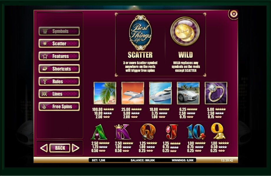 Best Things in Life gives you a unique opportunity to become rich. However, you need to collect a couple of interesting bonuses at first. To do that, simply collect matching items within the same paying line. At least three similar slots will trigger free spins.
