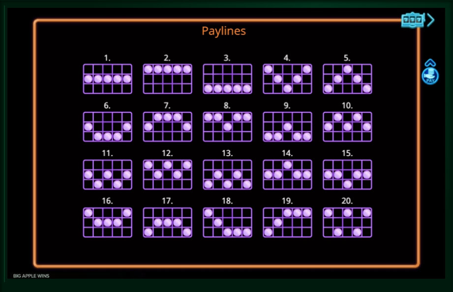 The slot consists of 5 (or 3) reels and 20 paylines. Surely, you will be pleased that Big Apple Wins has simple rules, which even an inexperienced player can easily understand. Most importantly, all necessary information is provided to your liking.