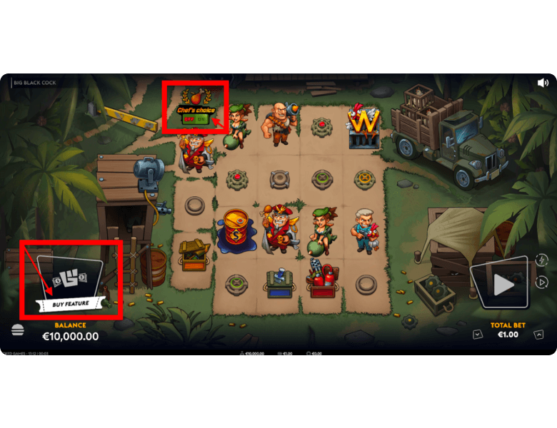 The buy menu here is absolutely stacked. Ante bets: Feeling Lucky at 5x pumps up your trigger odds, Chef’s Choice at 13x throws Frontal Assault onto every base spin (this one’s a game-changer), and Feeding Frenzy at 25x locks in two Scatters with a re-spin.