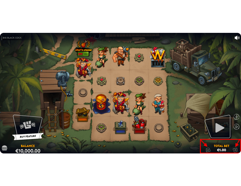 Here’s a neat chain reaction: when Frontal Assault drops a Wild right on top of a Scatter, that Scatter pops into a 2x2 Wild block. It’s how two Scatters can snowball into a full bonus during Cockfeness.