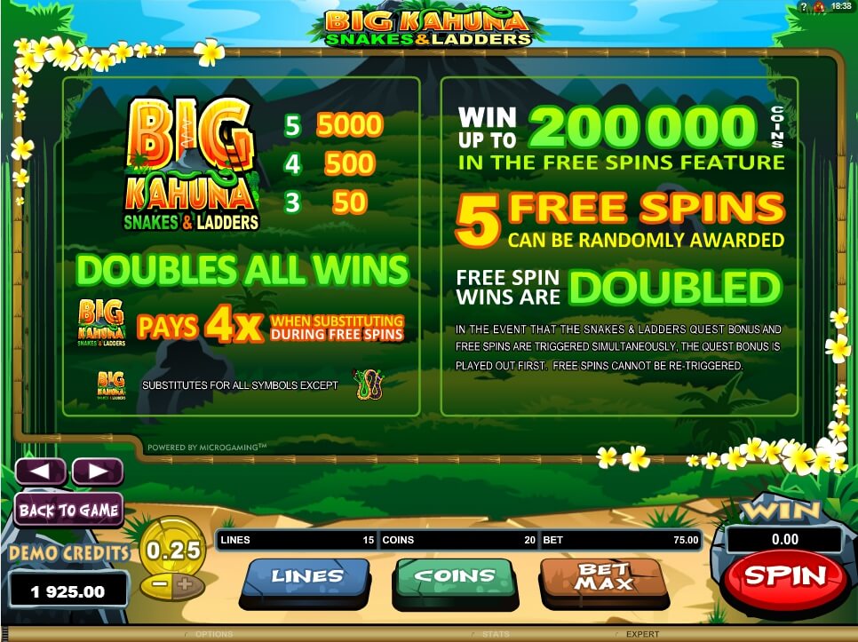 Getting real money from playing Big Kahuna Snakes and Ladders is possible. The gameplay is very easy and you can get prizes almost in any position. Representing a 15-payline slot, the game consists of 5 reels that are set against jungle. Here you can find 15 “Lines” to bet selecting coins value from 0.01 up to 0.25.