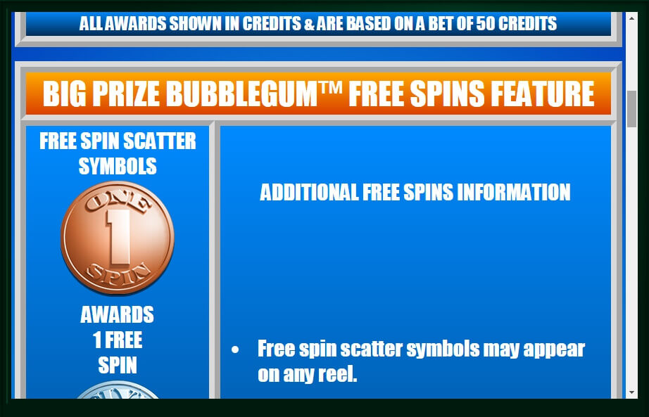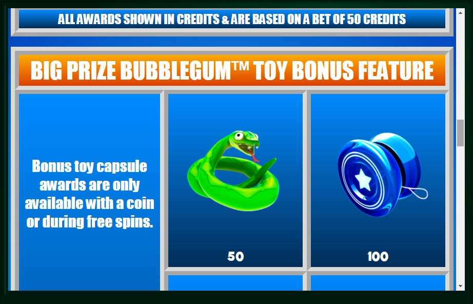 The Big Prize Bubblegum game has 5(4) reels and a generous amount of 1024 ways to hit high-priced treasures. You should not lose hope to win big cash prizes as you’ll have multiple ways to attain some monetary gains with relative ease. This bubblegum-themed slot is going to impress you with its multi-colored and user-friendly interface to make your gambling experience even more satisfying and pleasant.