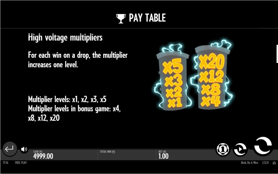 With the development of events, the design decision is even more impressive: with each spin produced birds will fly off the wires, giving way to new ones. If the player is lucky to form a winning combination, an electric discharge will be sent to the birds. But high tension is not the only danger that lies in wait for birds: they are hunted by cunning cats who want to get a tasty morsel.However, the management in the game does not differ from the others. The same buttons and functions are presented to players. The jackpot in this online game is 200 coins. Payouts for winning combinations depend on the selected bet: the higher the bet, the more impressive the jackpot can be broken. The bet is selected using the BET button on the right. The bet sizes range from 0.10 to 100.After the bet is made, you can start the game. The spin mode can also be made automatic if desired by the player. The high voltage multipliers will function with a special indicator to the left of the reels. It has indicators x1-x5. It is noteworthy that during the free spin multipliers will be listed an order of magnitude higher – x4, x8, x12, x20.