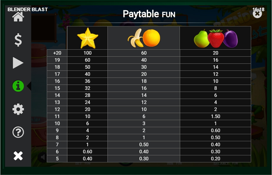 You can have a lot of money for different combinations of fruits, for example bananas and oranges. If you wind combinations of plumps, pears and strawberries on 20 pay lines, you will be able to get 4000 coins. You should have at least 5 symbols on the pay line to get a winning combination and get money for it.