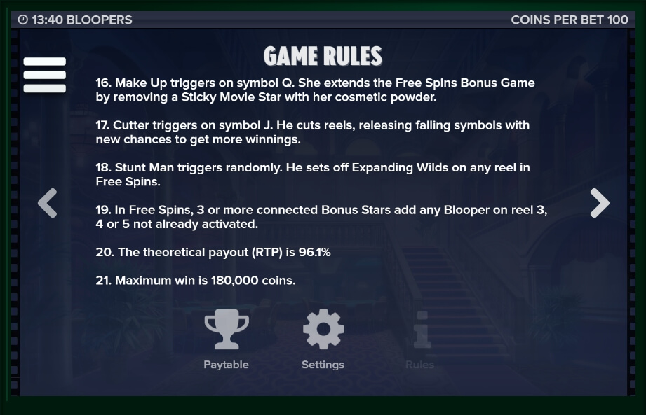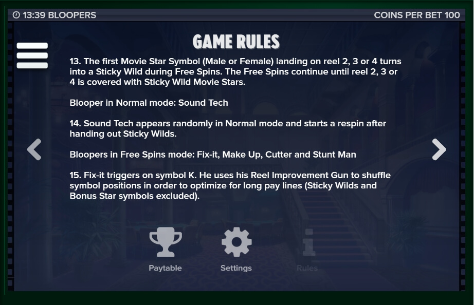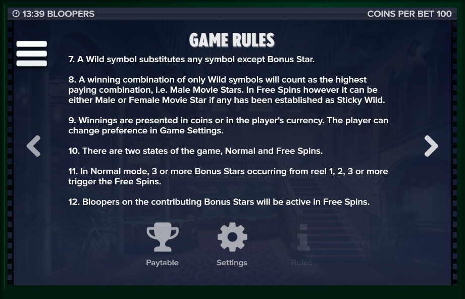As it is easy to guess, all the symbols in The Bloopers casino game reflect this or that aspect of the movie awards. Here you can find a star from the Hollywood Walk of Fame, some portraits of actresses and actors, various award figurines from the film festivals. The slot machine also has a standard set of the card symbols, that form the winning combinations almost in every round. The Bloopers five-reel slot also features the special characters, designed to help the player get as many coins as possible: