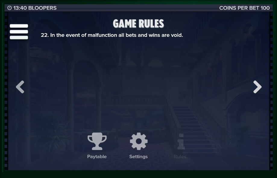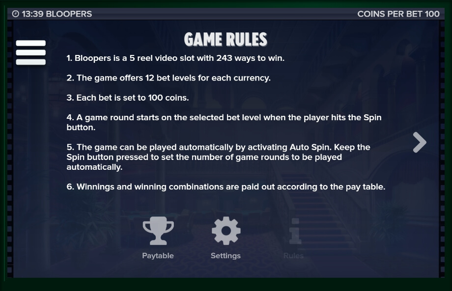 The Bloopers slot machine has 5 reels and 243 possible active lines. The number of coins is fixed: for each line, you can put only 100 coins, but the denomination of the coins is only 1 cent, so you cannot be afraid of losing a big lump of money at once. The jackpot in the game is equal to 600 maximum denominations of coins, and the slot return rate is very pleasant – 96.5%, which is a pretty high figure for the Elk Studios gaming machines.