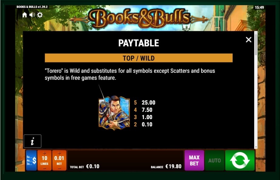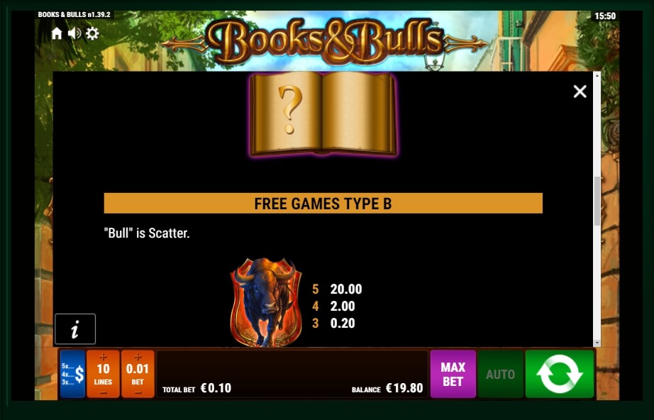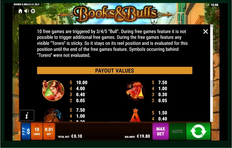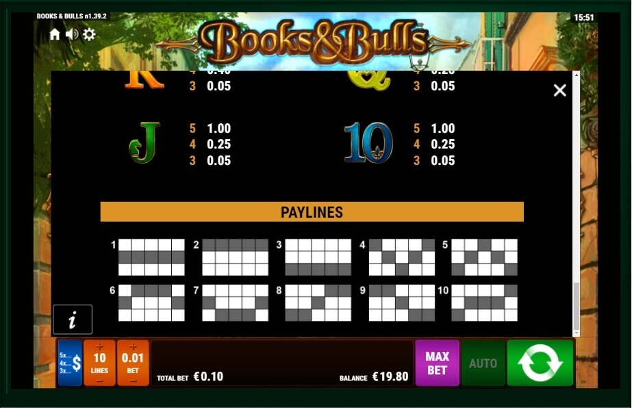 Books and Bulls it is traditional video slot game with 5 reels and three rows in height. Players will see 15 spaces on the screen. To check out a paytable and the price of each symbol, the gambler has to press the “dollar” button. There are also 11 symbols that can form a winning combination quickly. By the way, players will see 10 paylines on the interface.