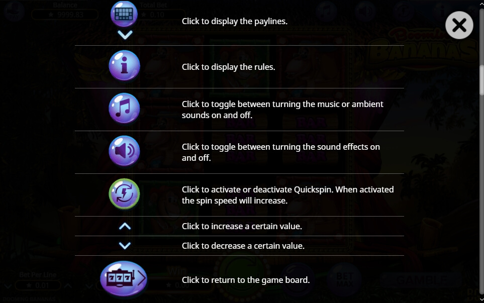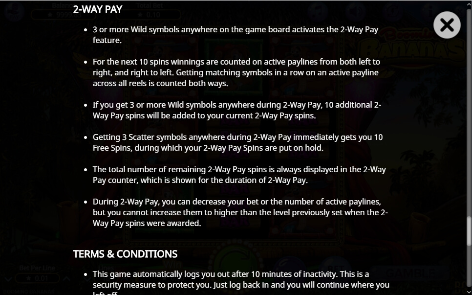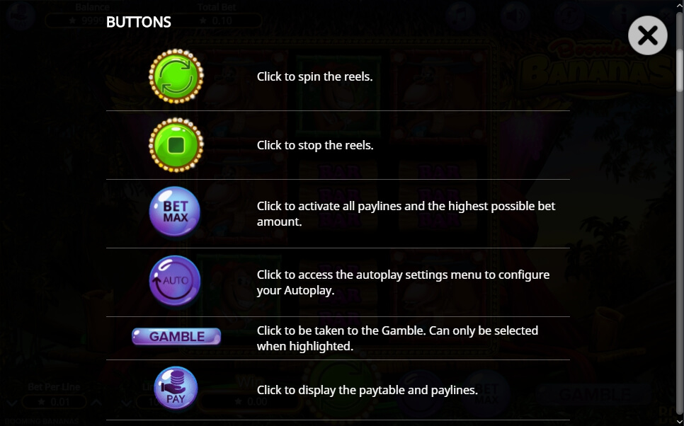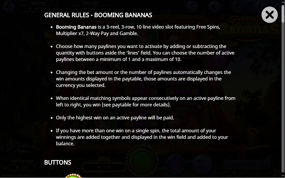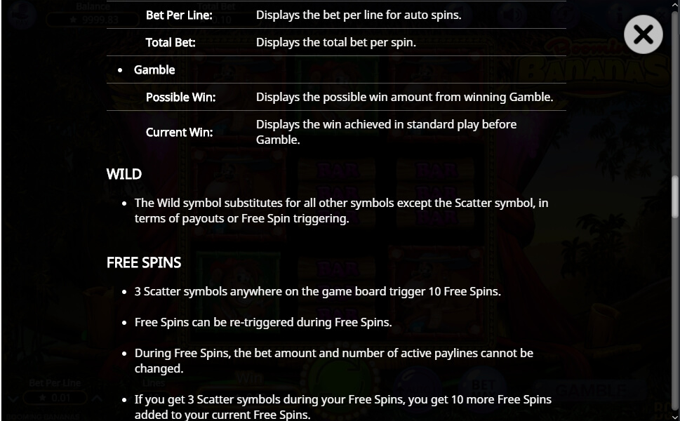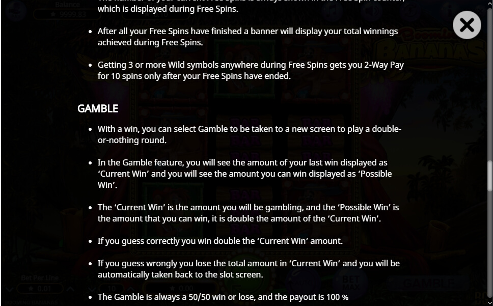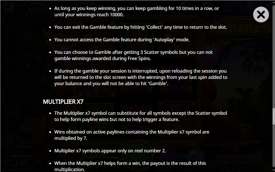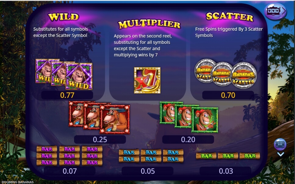 A set of special characters that affect the Booming Bananas casino slot gameplay is standard, but the characters themselves have their own characteristics. The monkey is the Wild symbol that not only creates winning combinations but also replaces other pictures, increasing the winning amount by half. They can form up to 6 winning combinations with different odds. The Booming Banana performs the function of Scatter. Three, four or five of these images trigger 10, 20 or 50 free spins of the reels. During this round, the Wild symbol multiplies the winning amount by three and at the time of its appearing on the screen, it stretches to all three cells of the reel.The Booming Bananas three-reel video slot also contains an original bonus game, which starts after a special 7-Times Banana Multiplier lands on the screen. The game is called Super Stack. It is activated every time 3 or more Scatters appear on the screen. You get 10 auto-spins, which start immediately, and during the rotation, any winning lines will receive a multiplier of x3. If in the process of bonus rotations you collect 3 or more Scatters on the field again, the game will continue. Another bonus game in the Booming Bananas video slot is called Gamble, and you can activate it at will after any winning combination by clicking the appropriate button. This game is standard for most slots: you need to guess the color and suit of the card. In the first case, you will double your winnings, in the second – increase it by 4 times.