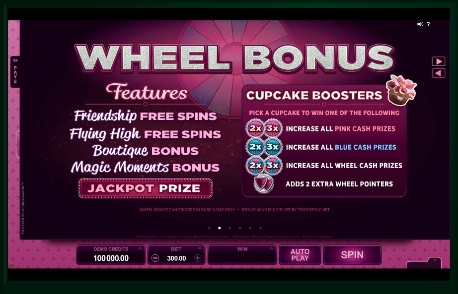 Special features are Stacked Wild (the Bridesmaids logo) and Scatter (cake). The former forms its own combos. The second is paid regardless of the location on the screen and the winnings are calculated at the general rate. In addition, three such images open a mini-game “Wheel Bonus”.