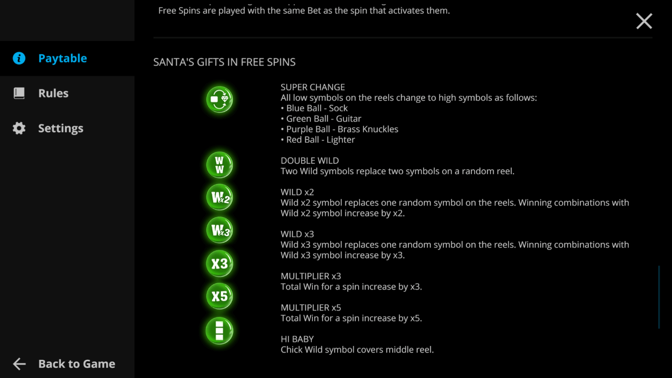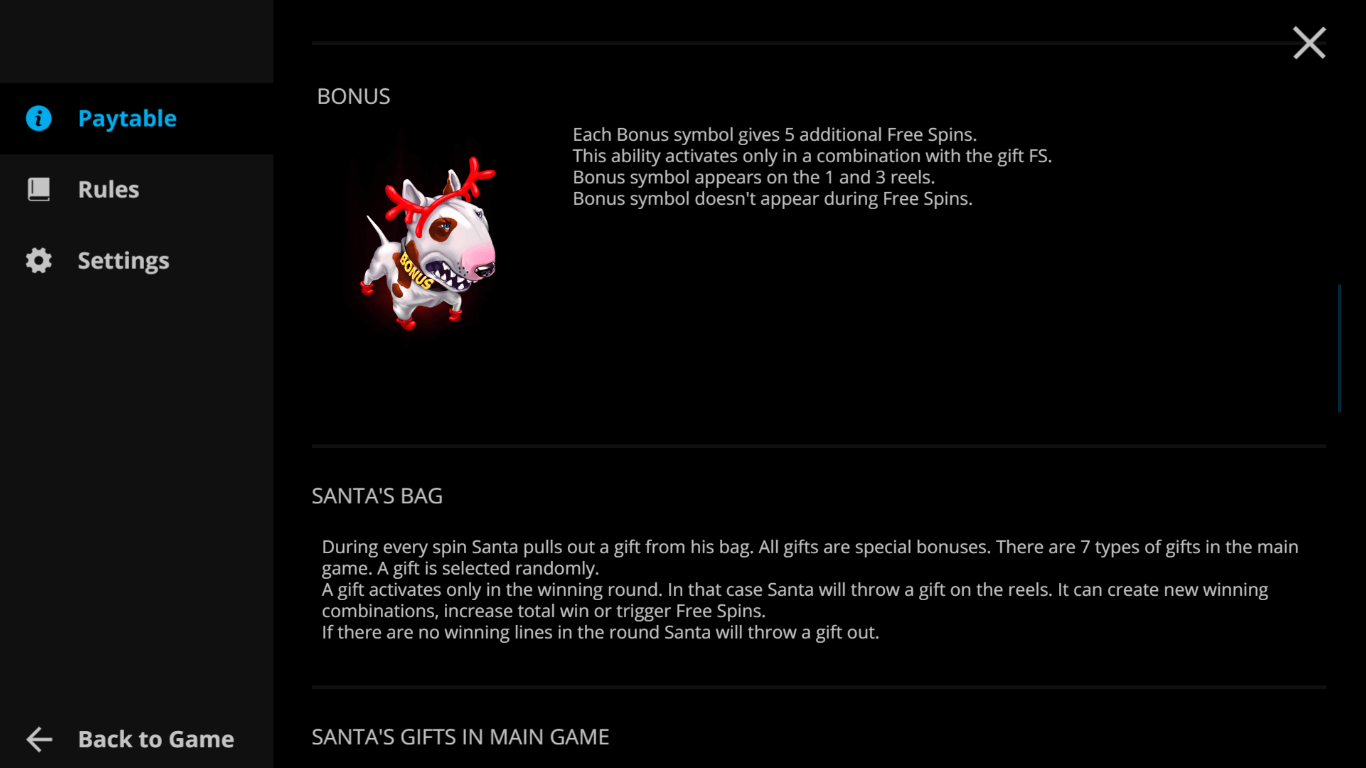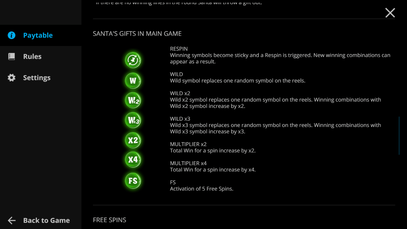 Free Spins — triggers 5 free spins with extra bonuses and features from Santa.