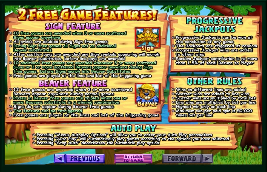 The other elements create a lot of different possible winning composition. The gamer can find the detailed information as for the value of any symbols composition, clicking the Help button. The Wild symbol is the Builder Beaver that replaces the regular characters, but not the scatter logotype of the Beaver Logging Co. If three beaver elements appear, the gamer will enter the additional bonus with twelve free spins and tripled payouts. The Scatter is a logo of the Beaver Logging Co that is the beaver’s building company. The triple scatter on the paylines provides free spins and doubled payouts.