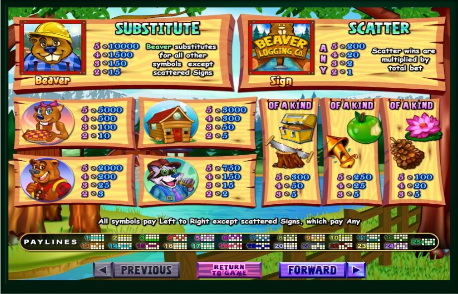 Five reels are in the central part of the Builder Beaver slot. With the numerals on both parts of the drum, the gambler can initiate up to 25 pay-lines and if he/she activates all the lines, the wins will be more attractable. The button Lines is under the drums.