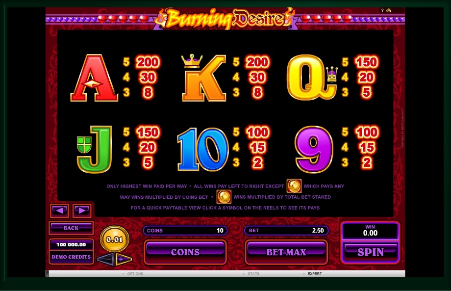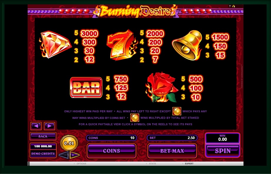 Love… It is so fantastic, so gently and so powerful feeling! Love encourages people to a feat, inspires on the great deeds. Without love and respect for each other, we will cease to be PEOPLE! The wise ”Microgaming” online casino provider has made simultaneously a very romantic and gambling video slot! In our turn, we have written this review. Switch on the Burning Desire slot machine and you will feel the ”hot” atmosphere of the opportunity to play it without any registration and downloads!