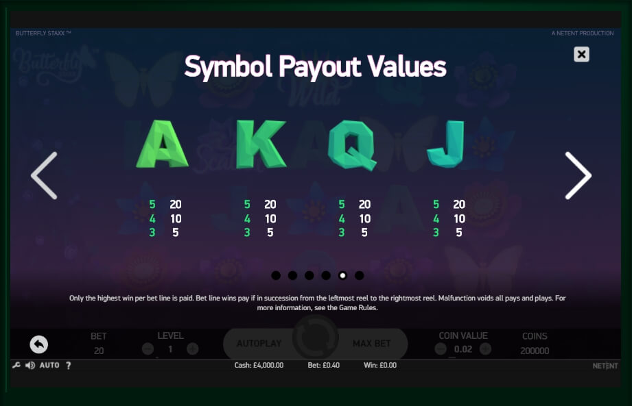Butterfly Staxx slot game symbols fully reflect the theme: they are glowing night colors of different shades. Card symbols are also present and executed very discreetly and vividly. In the game emulator Butterfly Staxx there is also a full set of symbols with advanced features: