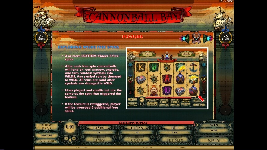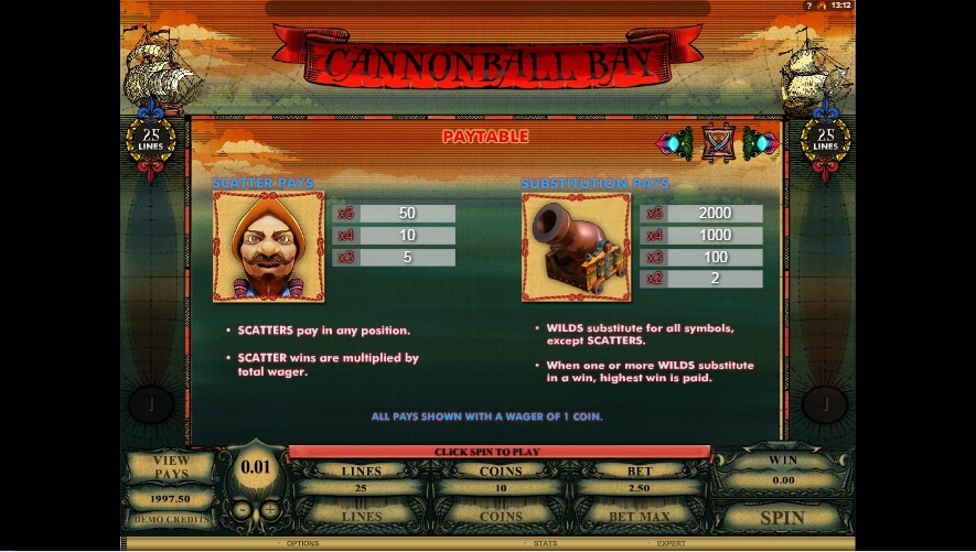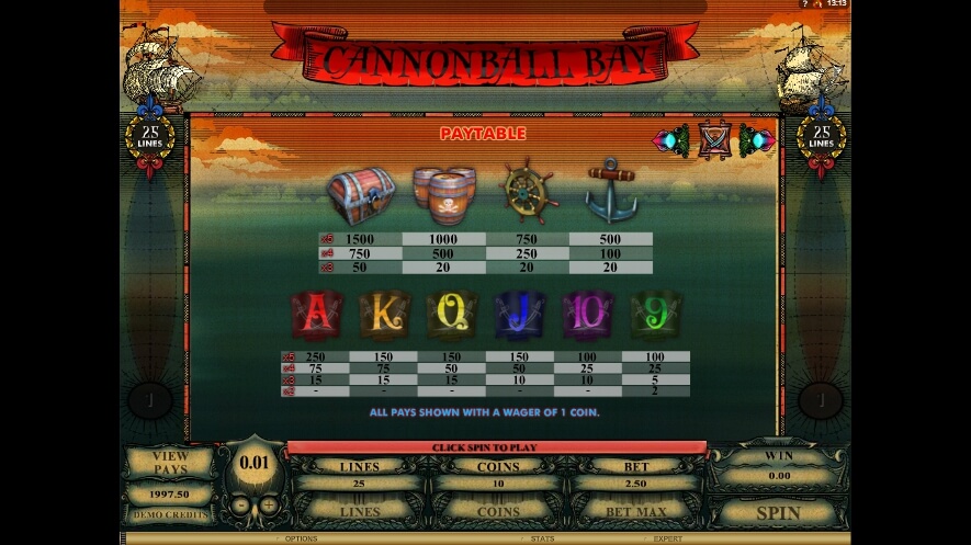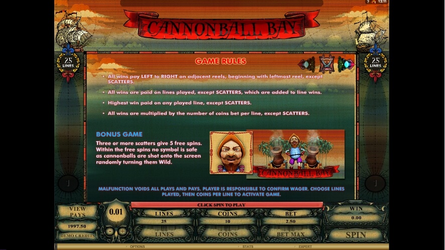 Cannonball Bay slot machine is equipped with 5 reels, has 25 active lines, for each of which you can put from 1 to 20 coins with a nominal value from 1 to 10 cents. For high rollers, there is good news in the form of a jackpot, which is equal to 2000 coins.