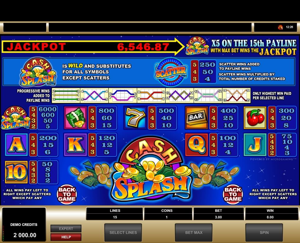 The Cash Splash 5 Reel slot has standard 5 reels and 15 paylines. The wager and the range of bets here are fixed – you can bet only with one coin per line, and its value is 2 cents. The game also has a huge jackpot, which is equal to 6000 bets and a pretty high recoil coefficient – 91.6%. If you’re a newbie, we recommend you play Cash Splash 5 Reel in free mode to study its main features more clearly. The demo-mode is available in all casinos which are operating under the Microgaming partnership license.