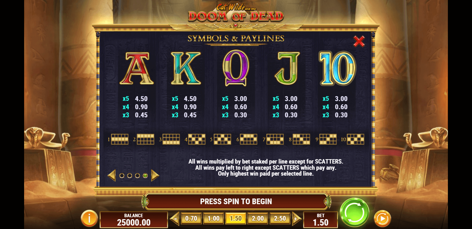 Cat Wilde and the Doom of Dead builds on the "Book of" formula made famous by Book of Dead, but with its twist. Both share the 10-payline layout, high volatility, and free spins with expanding symbols, but Cat Wilde and the Doom of Dead adds Expanding Wilds to the mix, giving the base game more punch.