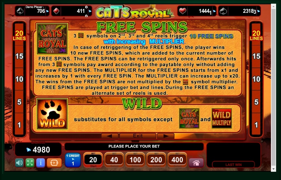 The Cats Royal slot machine will gladden gamblers with various bonuses. The first one is free rotation. As soon as three scatter symbols appear on the central reels, ten free spins will be activated. Free spins are played at the current bet and the selected lines. If at this time the cats royal symbols appear on the screen, the amount of winnings will be increased to 20 times.