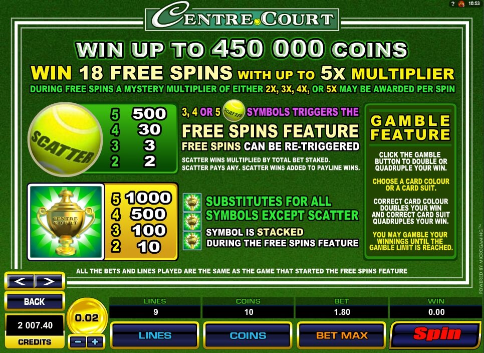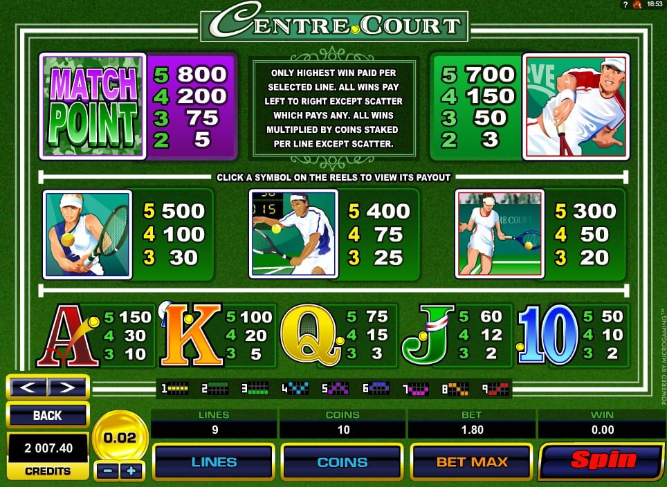 The Centre Court Slot Game is a fun and simple casino game developed by Microgaming. This game is ideal for the novice players and those who want to learn the rules of online slot machine games. It has a very simple gameplay, attractive interface and great prizes. It can be played for free or for real money.
