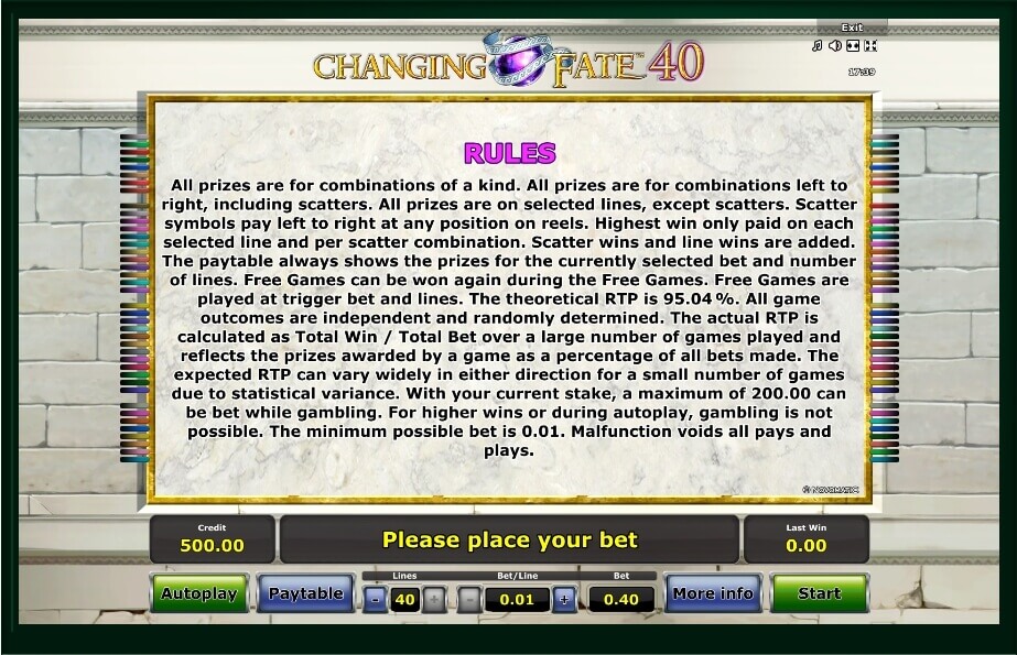 According to the name, 40 paylines take part in the game process. This indicator is controlled by the Lines key. After that, the client needs to go to the theoretical section (Paytable). Here he/she will find information about the symbols, payouts and structure of all lines. After all the preparation steps, the user can activate the manual or automatic spinning mode. The system also offers several buttons for additional settings.