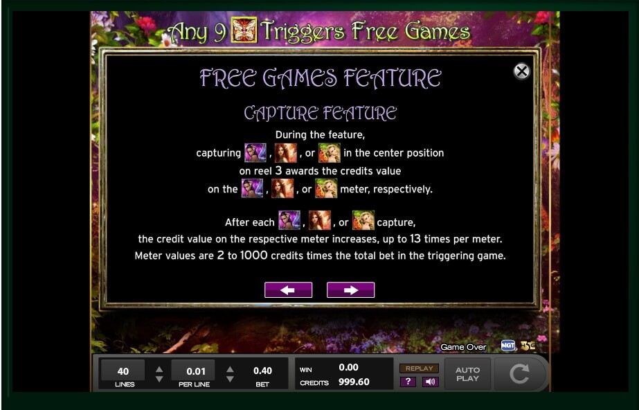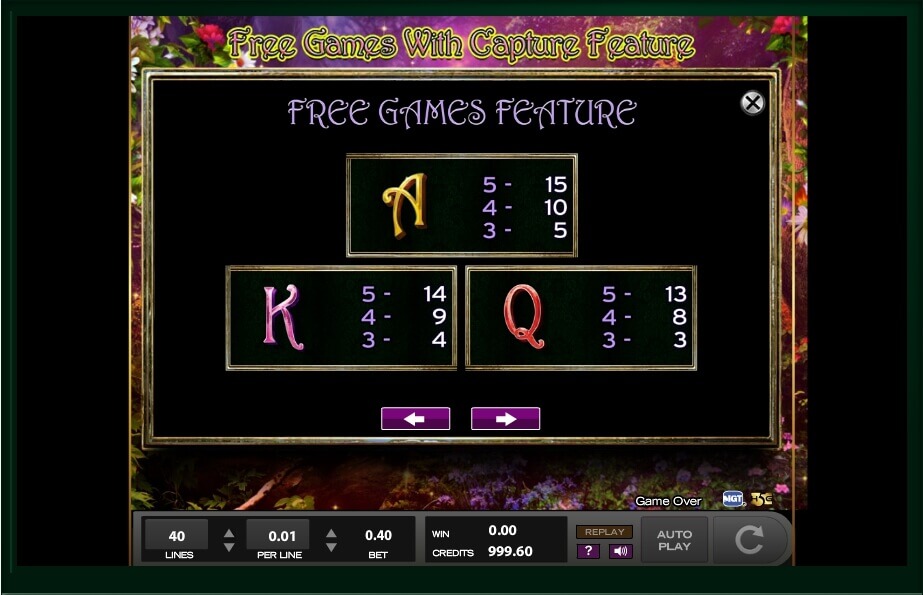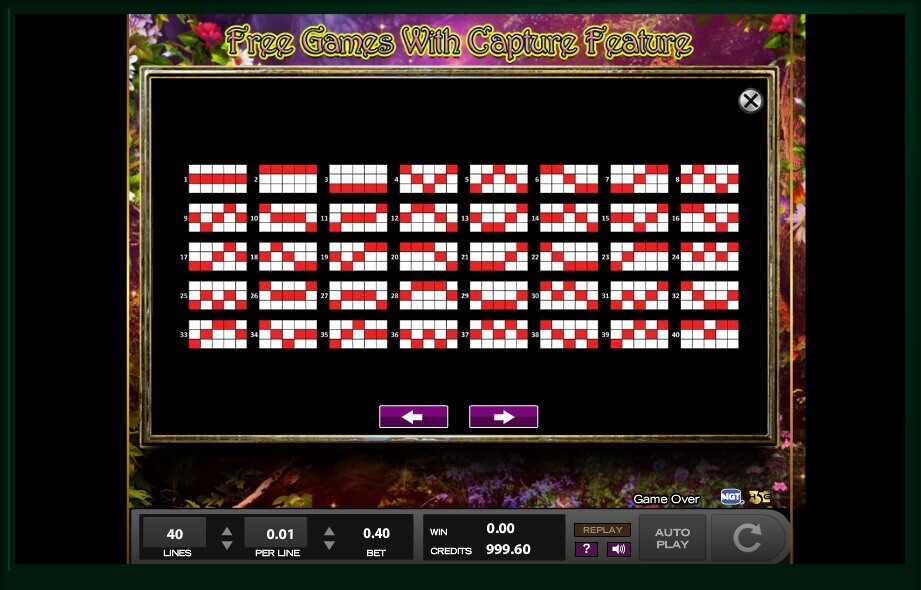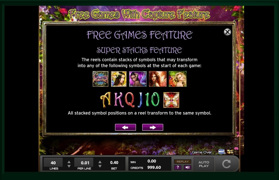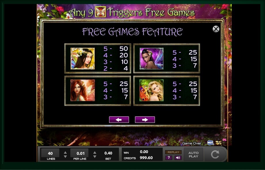 And the third interesting feature here is an opportunity to collect fairies. There are three beauties that can be taken, and one of them is the Queen of fairies. The more fairies you collect, the bigger the overall winning cash will be. Moreover, if you are lucky enough, there will be an option to trigger a massive jackpot game that may result in a 40,000-credit payout depending on an actual currency in use.