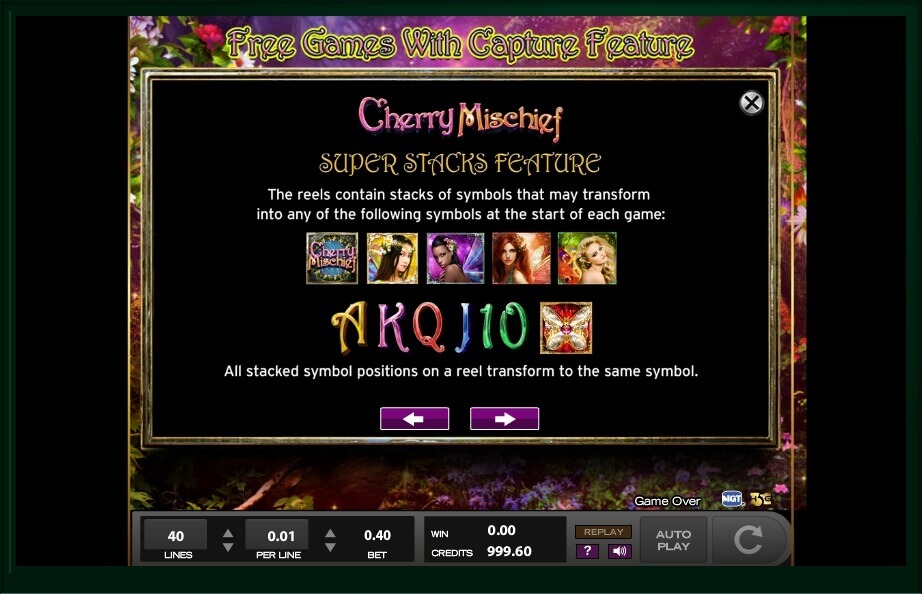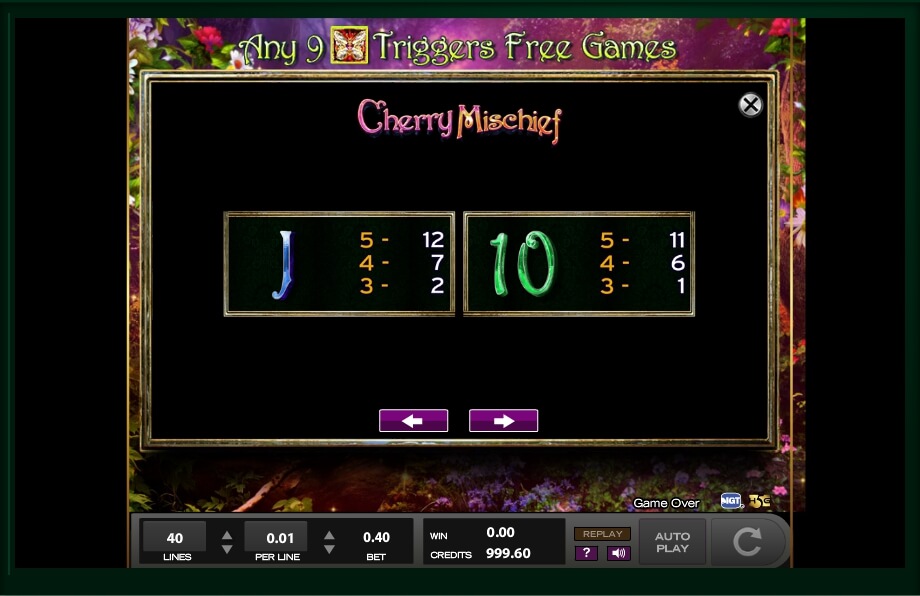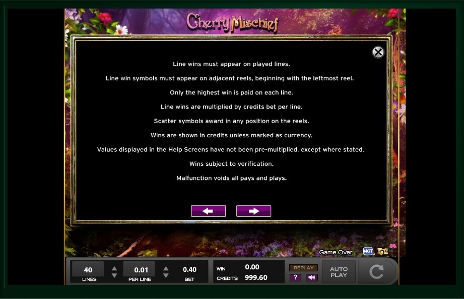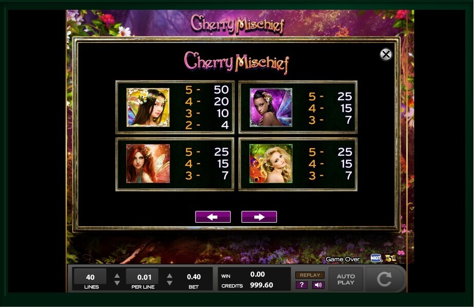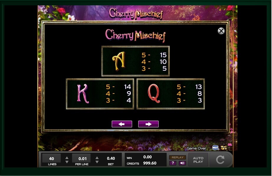 As for the game flow, Cherry Mischief has all the classic features needed for a good and long playthrough. From the start, there are 5 reels with 3 rows to spin around and 40 paylines to make combos from. The quantity of paylines per spin depends on the actual bet placed. The minimum possible bet is 0.01, while the maximum one is limited to 1.0.