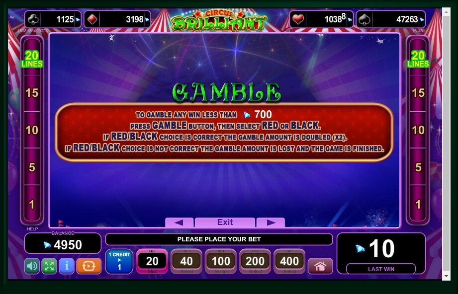 After each win, you can double your reward by taking advantage of the gamble risk mode. On the screen you will see cards that alternately flash black and red. Having correctly determined the colour of the card, you get a double win. However, remember that an unsuccessful attempt will deprive you of the entire prize amount.