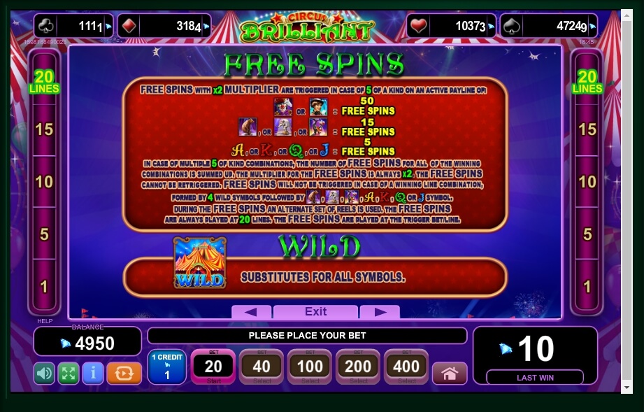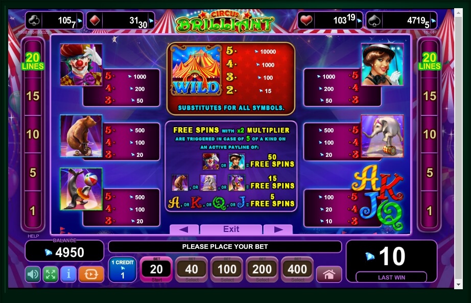 Circus Brilliant contains a round of free spins. It starts when five identical pictures form a combination on the line. All payments are doubled here. For more information, see the detailed rules section.