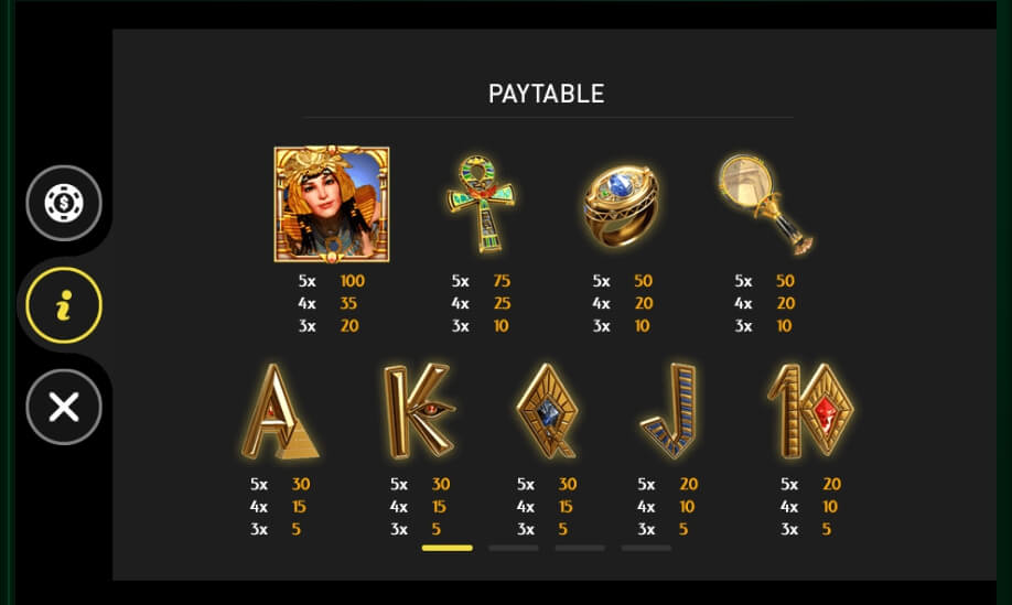 You see, that playing this slot, you are in the center of the magic atmosphere of ancient Egypt and its Queen. All of the details contribute to these special feelings and strong spirit of the old civilization. It’s quite clear, that the designers made a hard work to create such product, as this slot machine. Pay attention to the great graphics, high – quality animation, nice colors and amazing music. All of these elements create the whole image of this casino slot. Thanks to developers, you will have those magic emotions during the playing.