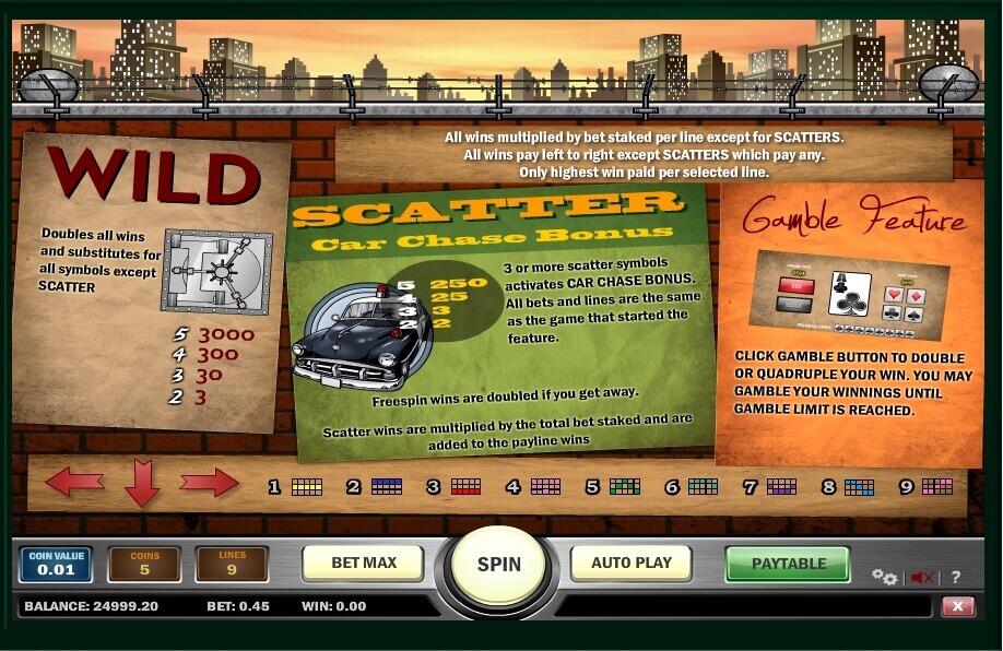 Now you are in the new version of the old video slot, where everything is different: style, graphics, design approach, and themes. Everything corresponds to the gangster atmosphere, here Cops and Robbers, jewelry and diamonds, there is everything in here. You can choose from 9 available lines, and you can put up to 5 coins on each, and also decide how expensive the coin will be.