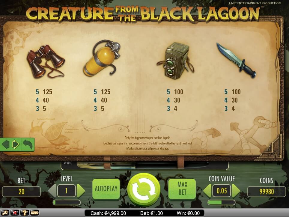 As a result, the Creature from the Black Lagoon will suit all lovers of the genre, connoisseurs of classical cinema, and just fans of the NetEnt slots. Colorful design, in combination with thoughtful gameplay, creates a pleasant atmosphere in the game, and the prize level can bring real big winnings to players. Lead a risky expedition and get a lot of impressions from the wonderful online game!