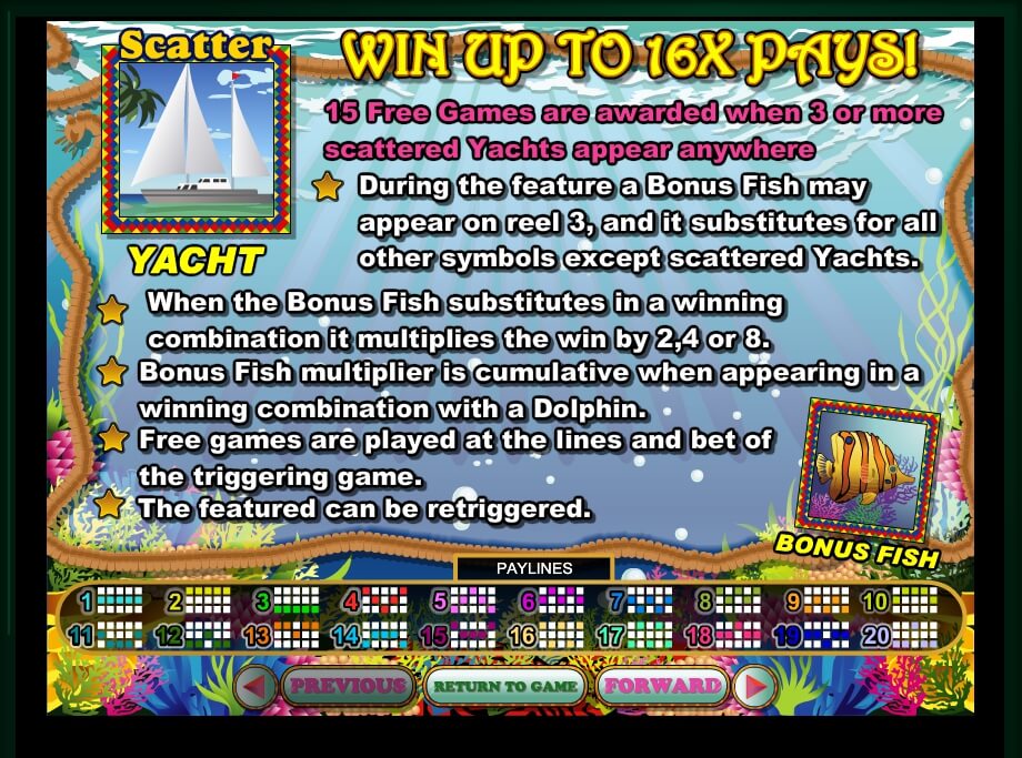 Wild Dolphin serves as a replacement element in any winning composition, except for scattered yachts. Each time the wild dolphins replace elements in a winning composition, the gambler’s prizes are doubled. The scattered Yachts will provide the gambler with 15 free rotations when three or more of them sail to any place on the sea reels.