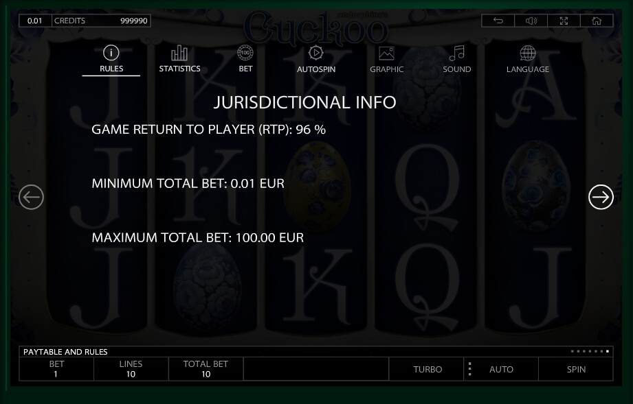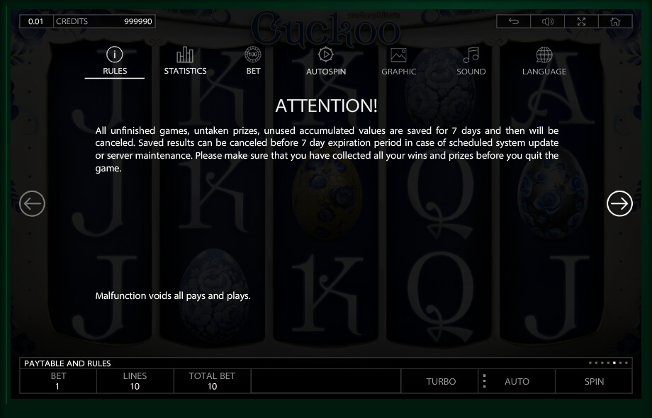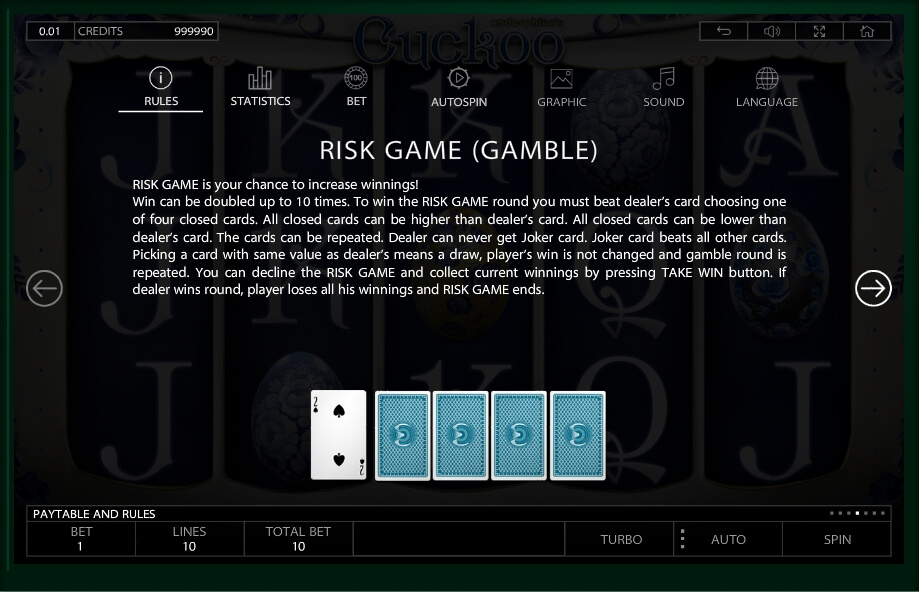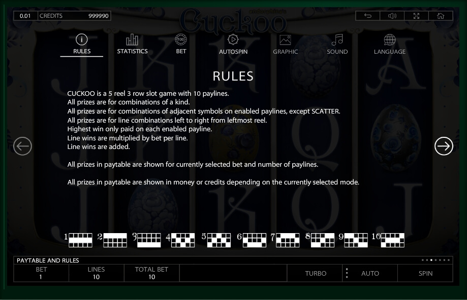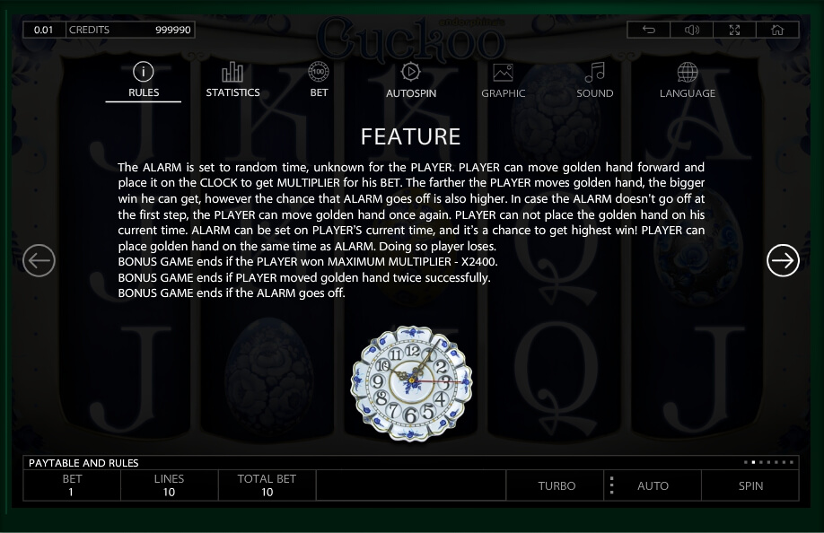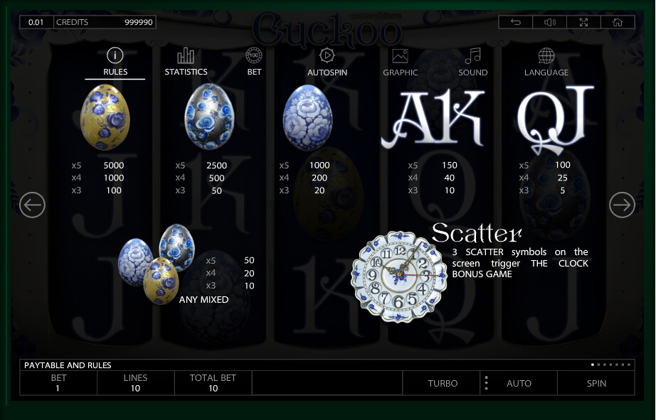 The Cuckoo slot machine has 5 reels and 10 active lines. Game symbols can form combinations not only in a straight line, but also diagonally, or in a column. The wager in the game varies from 1 to 10 coins per line, and the range of rates is from 1 to 100 cents. A jackpot in the game is equal to 5000 coins.