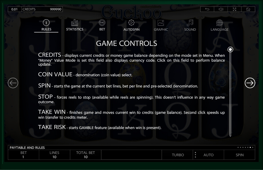 The Cuckoo gaming machine will attract your attention right after launch. The developers used for its color palette only three hues: white, blue with its shades, and gold. Despite this, the slot turned out to be quite beautiful, being decorated in the style of folk crafts, so the design will surely be remembered. Its control panel isn’t knocked out from the general style, and the commands located on it are familiar to each player: