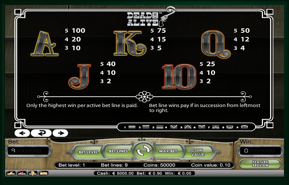 The game is very easy to play but hard to master. In order to join the game, you have to adjust your bet first. The bet level can be changed from the Bet Level option appearing on the screen. There are different sizes of coins available in the game ranging from 0.01 to 0.5. You can change the coin size from the Coin Value button. Moreover, there are different pay lines within the game which can be modified depending on your choice.In order to play the game without any disruption, you can click the Auto option. It will allow you to experience the game in the best possible way. Playing Dead or Alive slot you can win some exciting prizes. Besides the prizes, there are free spins and bonus rounds as well.Features