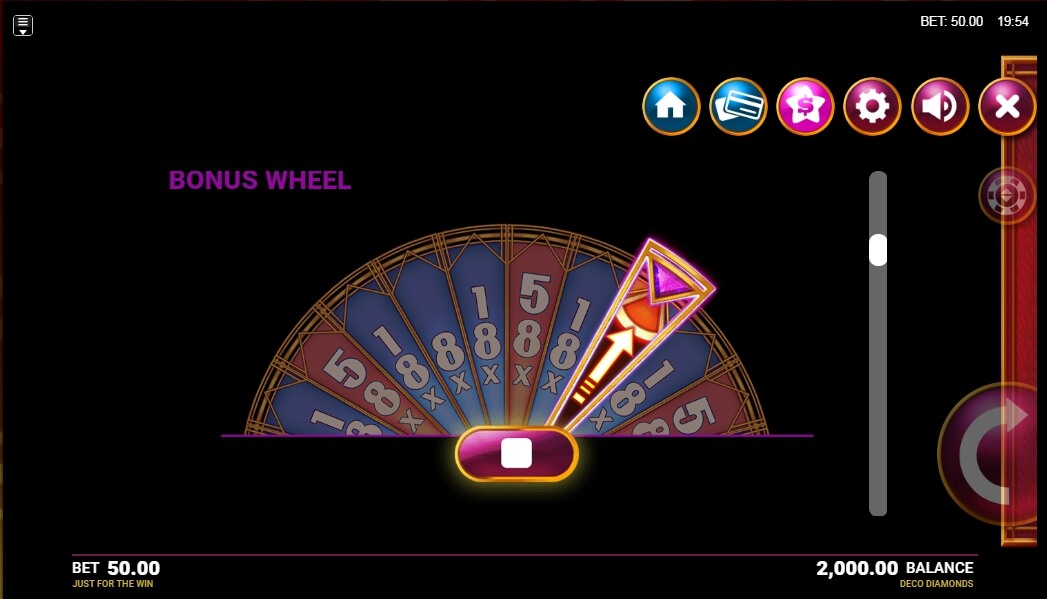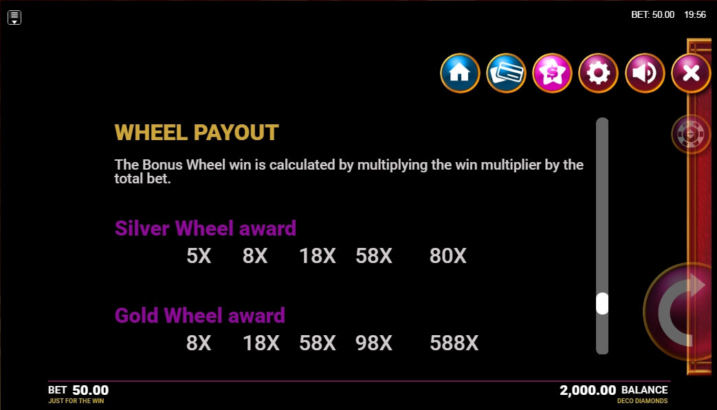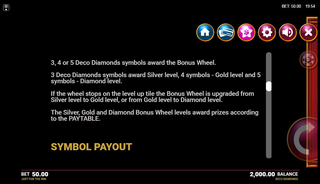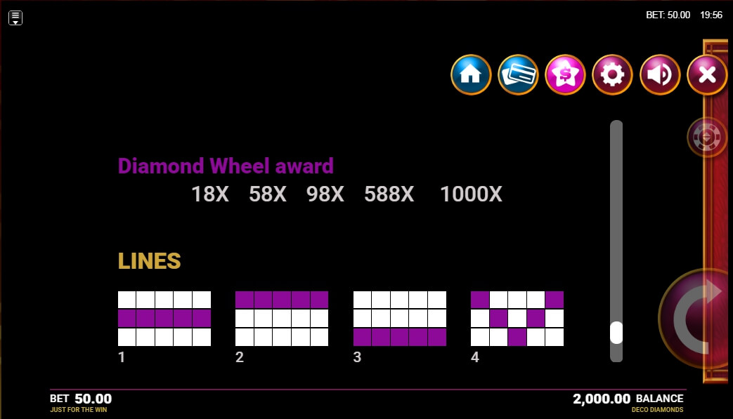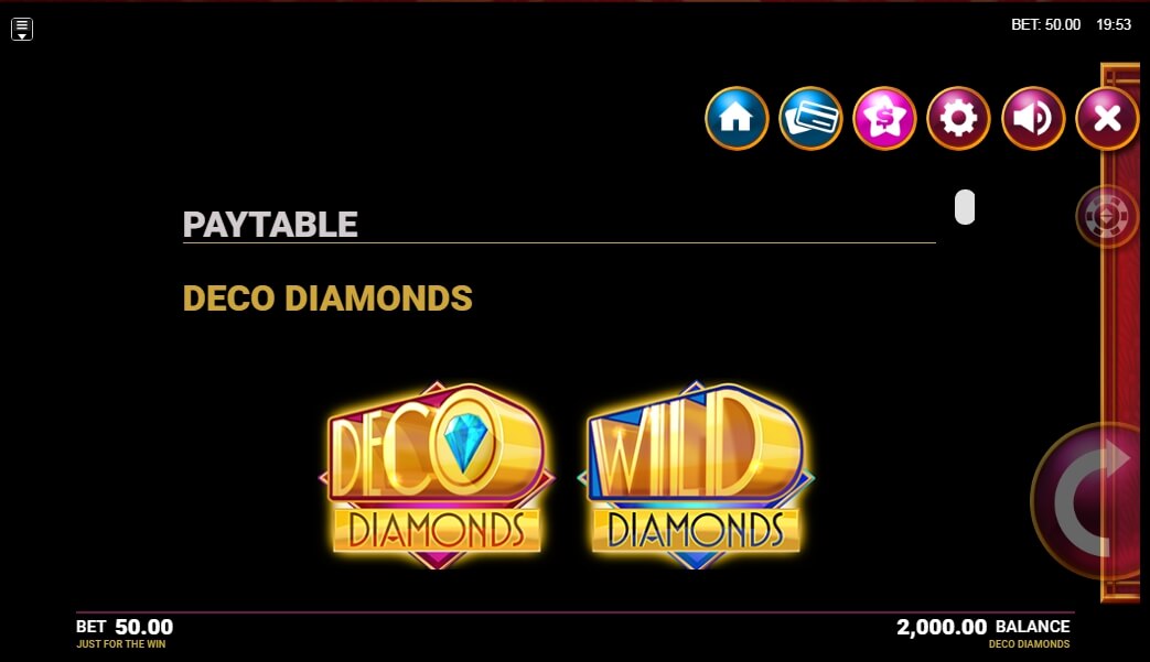 The control panel is moved to the right. The buttons are not signed, but by their design it is clear which element launches new spins manually that serves to select the bet, and which one starts the auto game. In the upper right corner there is the menu button with the pay-table and the settings section. Payment calculation coefficients and general rules are published in the single window that you need to scroll. Adjust in Deco Diamonds you can sound, window size, the speed of the process and the number of spins.