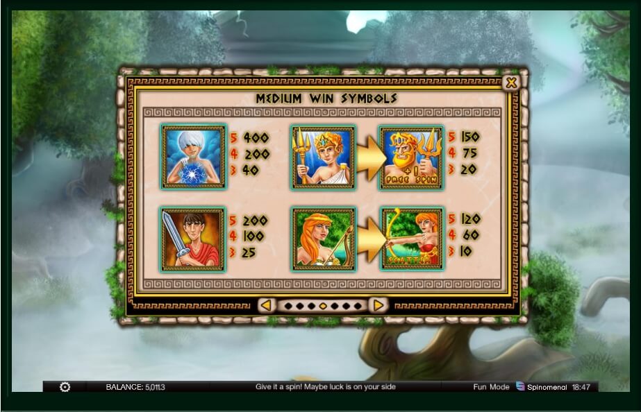 The symbol of the god Ares is the wild symbol that can expand if it appears on the second and fourth reel. Zeus also turns into the wild symbol, but it stays in place with the next rotation to increase your chances of winning. Poseidon is your key to free spins, and the Artemis Scatter symbol will multiply your prizes according to the number of the icons on all of the reels.