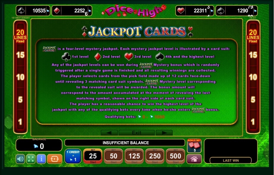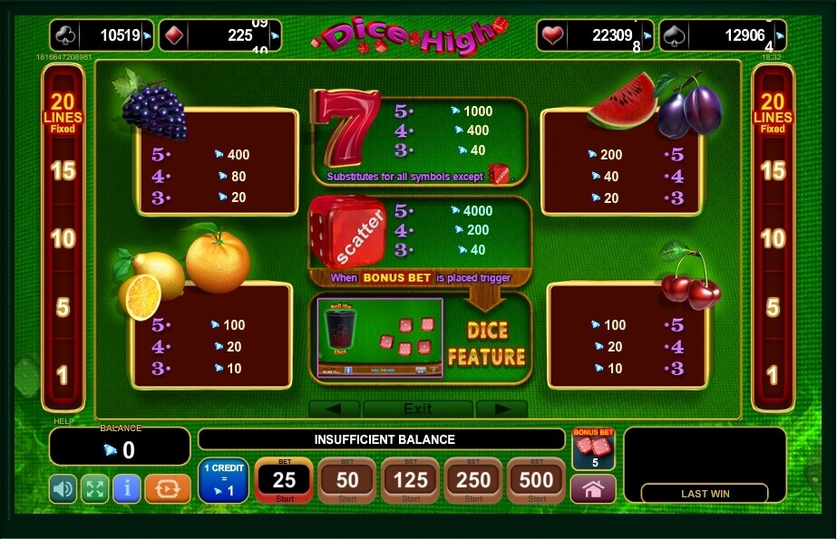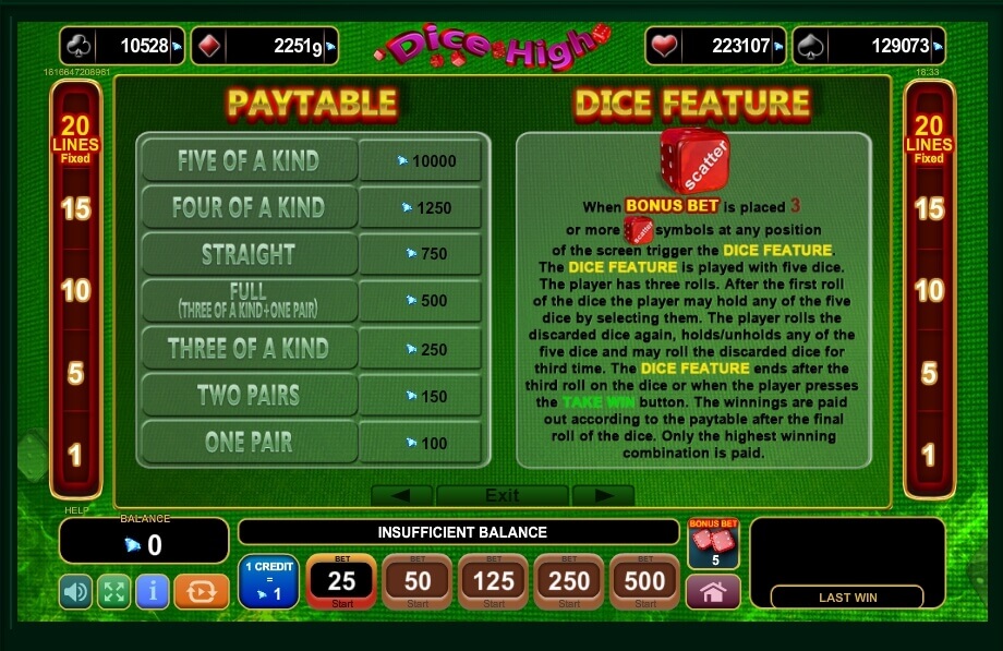 If you are looking for the Jackpot, it is 500000. You can be sure that it is a very great chance to earn real money in Dice High. You should be very lucky to get this sum of money. As you can see, the sum is too big that is why you should do your best to be an owner of this sum. Moreover, you can find the wild symbol here. It can change the symbols in the winning line to more expensive ones and that is why you will have a lot of different possibilities to get more money.