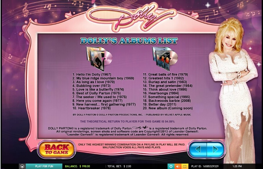 Dolly Parton has so many elements, that no review can tell you about all of them. Characters, visual representation, special effects background art are perfect. If a player is the true fan of music, then he will definitely like this one, as long, as it has surprises to offer.