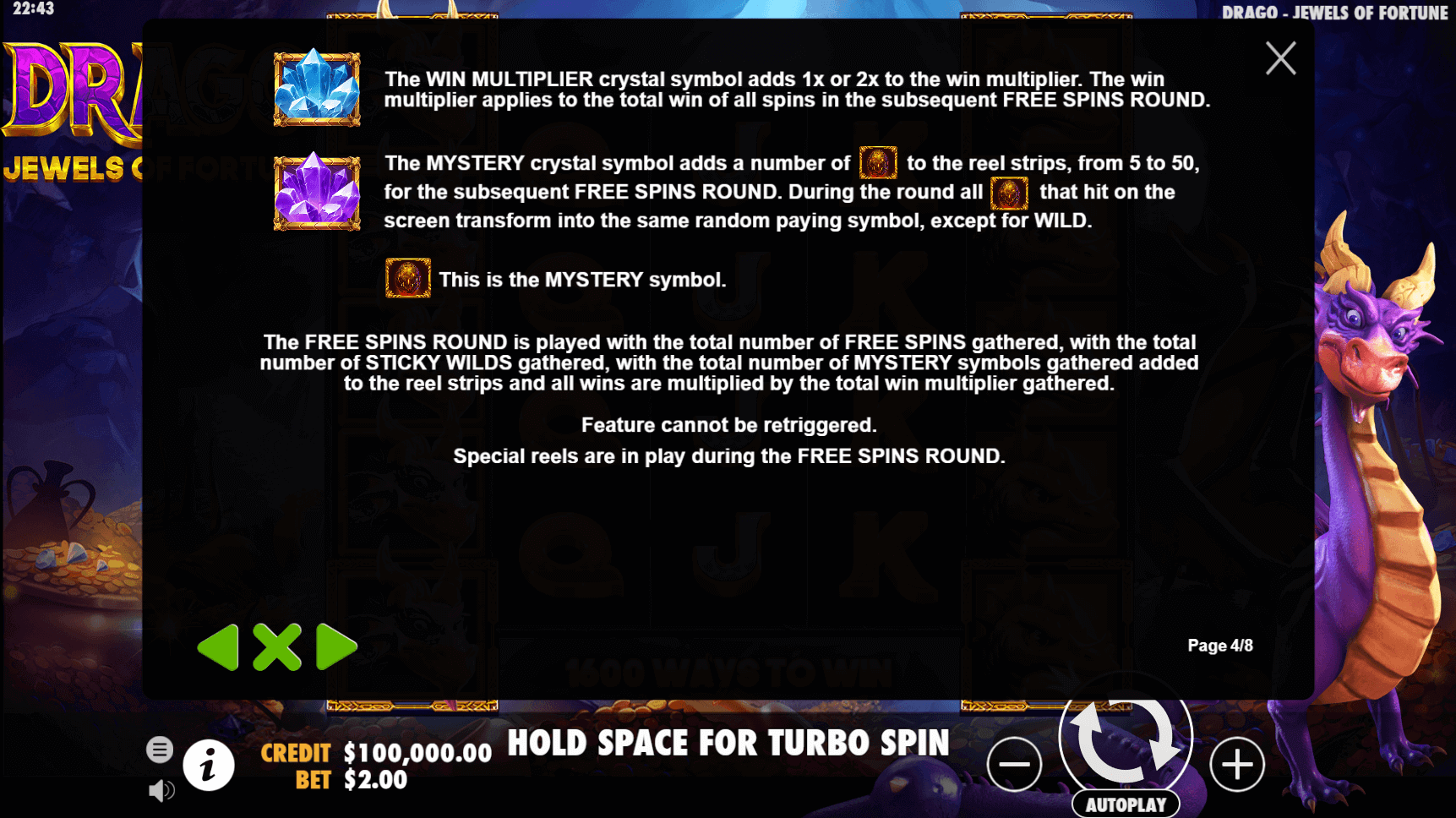 You can explore all the features of Drago – Jewels of Fortune for free by launching the slot machine for fun on our site. In addition to the unusual grid layout and 1,600 ways to win, players can enjoy 2 unique bonus rounds — free spins with additional features, as well as Dragon Spin with a unique mechanic.