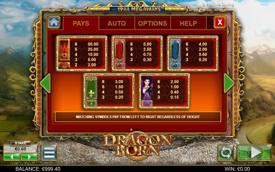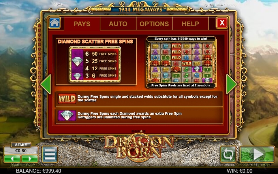 This slot has well-known Full Reel Wild icons. It counts up to 7 symbols, substituting every other one except for Scatter. Wilds multiply any involved combo up to x7. Multiple Full Reel Wilds in the same winning combo multiply each other. Diamond is the Scatter symbol and if you hit 3 or more of them anywhere on the reels you will trigger Free Spins. The number of spins depends on the number of symbols. You can win 6, 12, 25 or 50 free spins. During free spins single and stacked Wilds substitute for all symbols except for Scatters. Each diamond Scatter during free spins will award you with an extra spin. Megaways feature gives the chance for all the reels to produce up to 7 symbols. Wild multipliers increase the ways to win up to x7 per reel. Each spin can have up to 117649 ways to win.