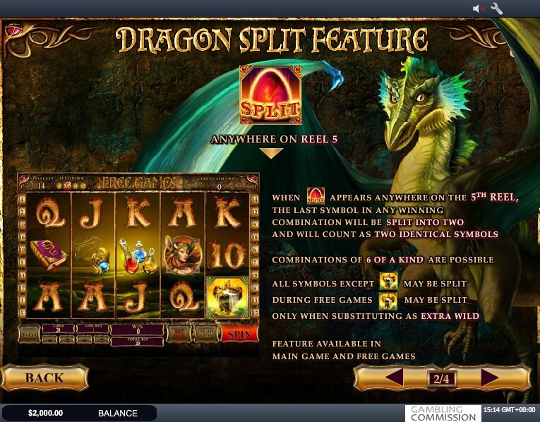 Special pictures in the videoslot Dragon Kingdom are three: Wild (green dragon), Scatter (floating in the air castle) and Split (the red egg of the dragon). Split falls only on the fifth drum. It can be divided into two separate symbols in profitable combinations, and then it turns into a combination of six images.