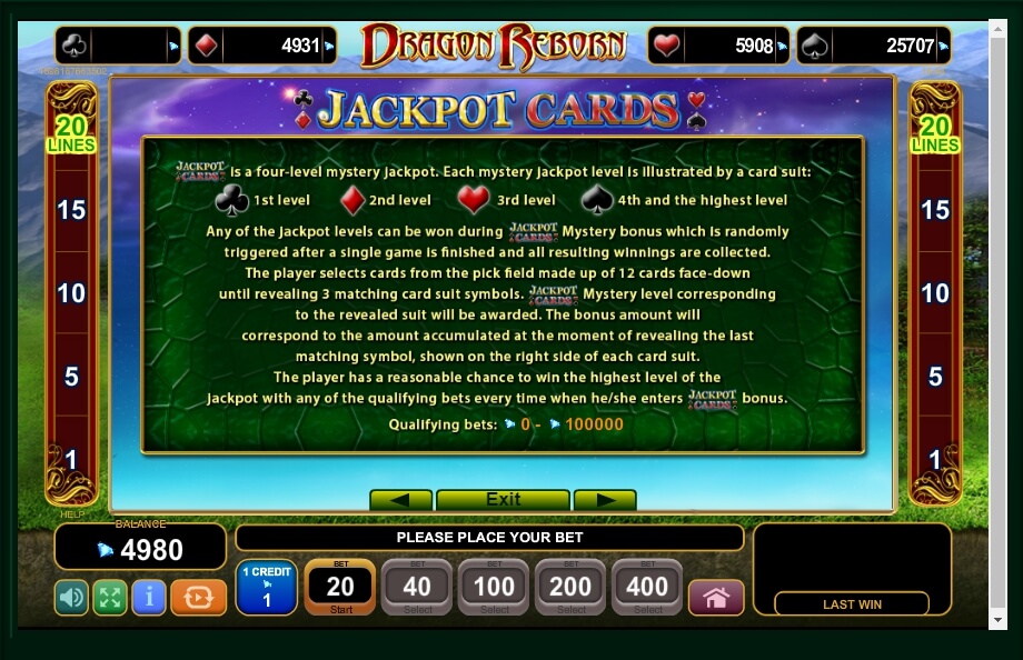 The Dragon Reborn slot machine provides four different Jackpots, which correspond to the names of four card suits. The draw of each of the four mysterious Jackpots can fall out randomly to a player. The essence of the game is that you need to choose three cards of the same suit from 12 ones.