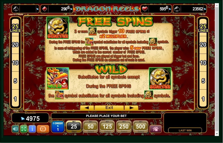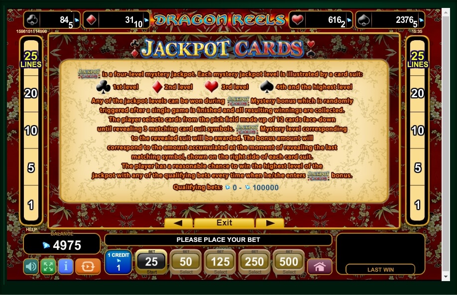 Also in Dragon Reels at your service are four mysterious Jack Pot (according to four card suits), the game for each of which is activated randomly. There, out of 12 cards, you have to choose three of the same suit.