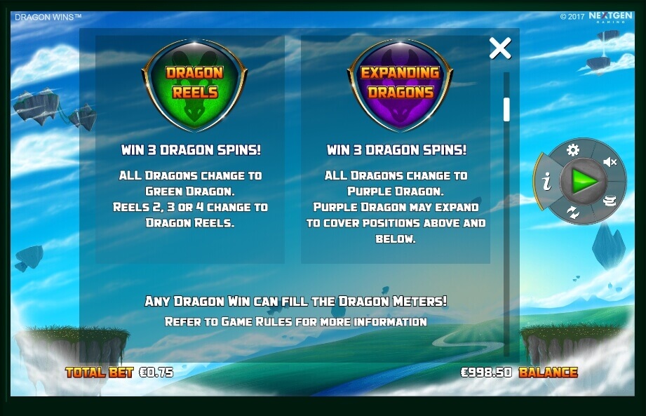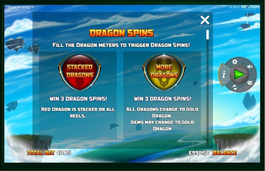 We can see that playing field is surrounded by 4 dragons. And each of them has a different scale. So, this detail is filled if a winning sequence of these characters is formed on the payline. If one of them is full, the participant will get additional feature. This option is described in detail in the payout table that is opened with the “i” button.